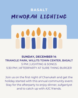 Join the Aspen Jewish Congregation to celebrate Chanukah with the annual tradition of the Basalt Menorah Lighting. The Basalt Menorah will be lit by at 5 p.m. at Triangle Park in Willits, followed by hosted appetizers at Sure Thing Burger. The Aspen Jewish Congregation hosts Chanukah festivities throughout the Roaring Fork Valley – visit the AJC website for a list of all Chanukah events.