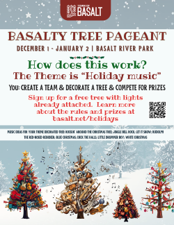 This year’s theme is “Holiday Music”. Trees are free and come decorated with lights and are staged at Basalt River Park.