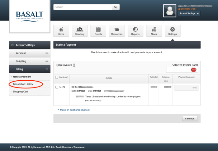 At the bottom of the original email, the user should click the “View/Pay Online” button. Alternatively, the user can log in directly to the Member Portal (instructions above). Clicking this button will open a web browser and direct the user to the landing section of the Billing page, where open invoices can be paid.