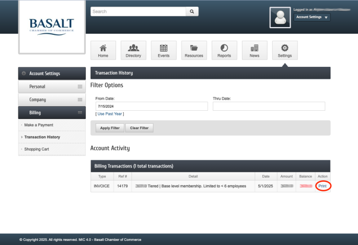 To find and download all invoices, the user needs to navigate to the Transaction History page. This can be done by clicking “Transaction History” in the left-hand column. Under the “Account Activity” section, click “Print” next to the relevant invoice details. A PDF copy of the invoice will then automatically download, unless the computer’s security settings prevent this action.